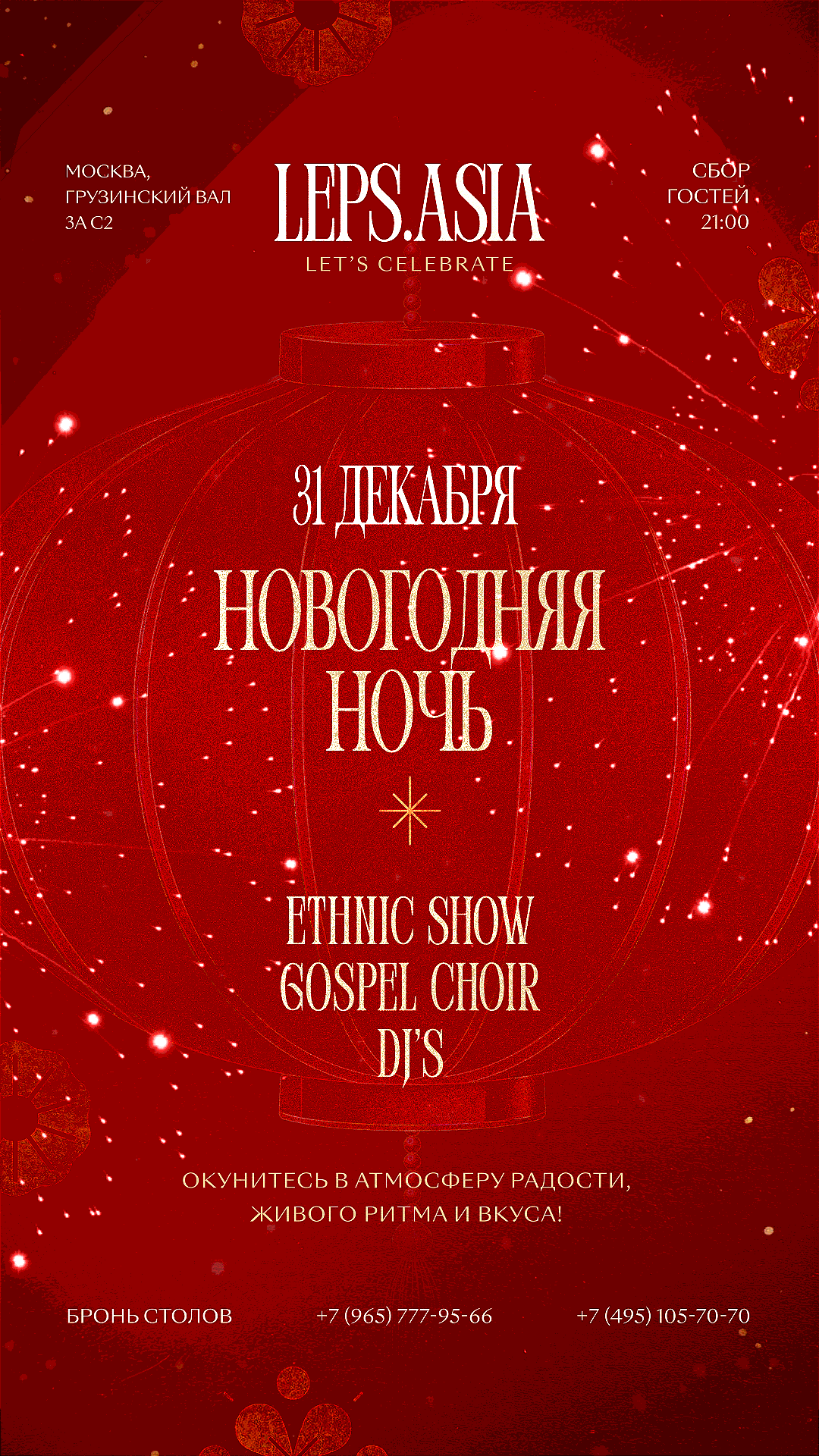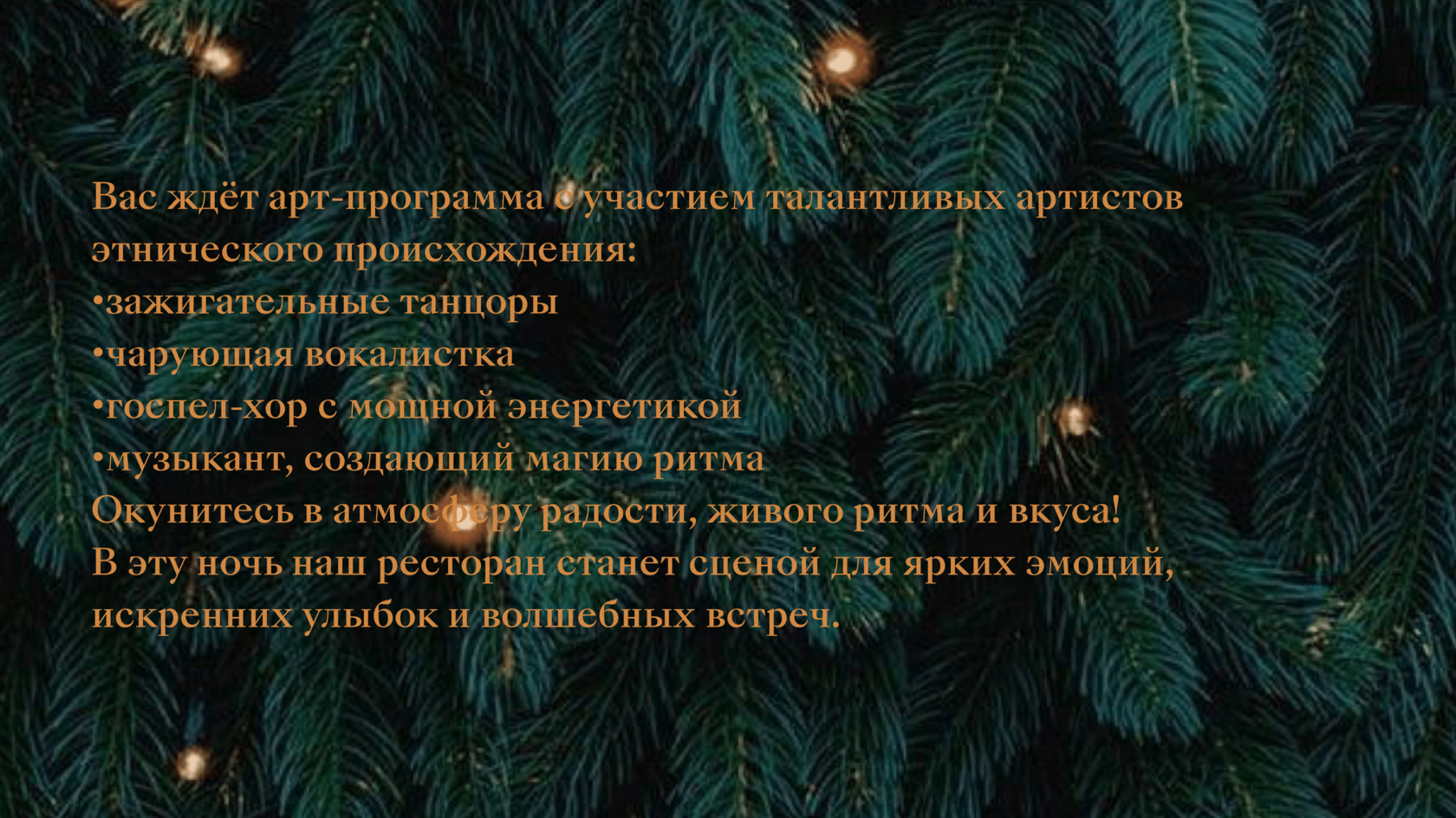 Окунитесь в атмосферу радости, живого ритма и вкуса! В эту ночь наш ресторан станет сценой для ярких эмоций, искренних улыбок и волшебных встреч.
