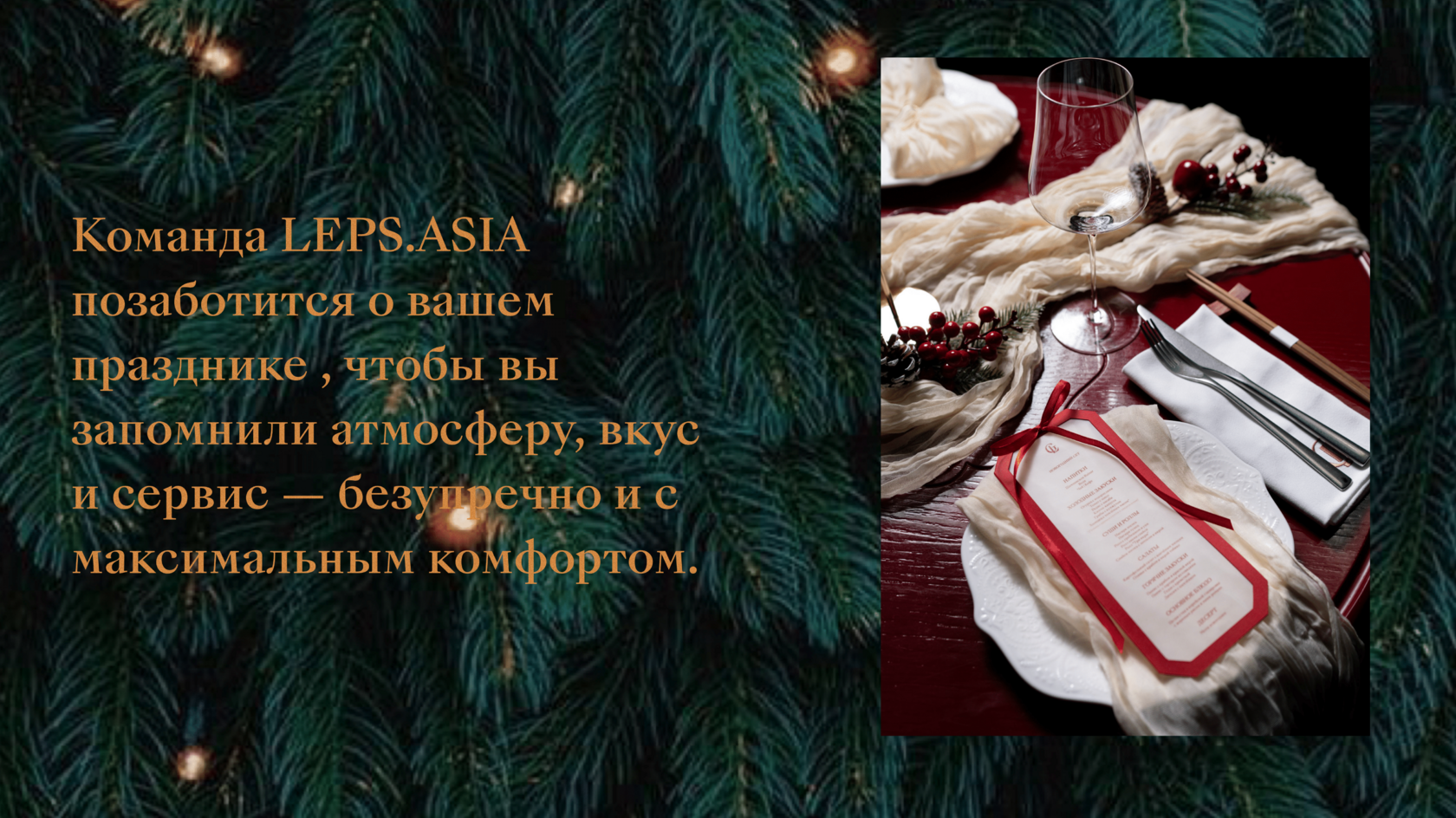 Команда LEPS.ASIA позаботится о вашем празднике , чтобы вы запомнили атмосферу, вкус и сервис — безупречно и с максимальным комфортом.